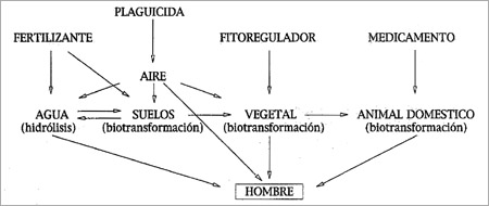 Luego que estos compuestos químicos cumplieron sus objetivos en la producción de alimentos, aún pueden permanecer como tales o como residuos. Estos residuos pueden generarse ya sea por acción de los elementos del medio ambiente: aire, agua, luz ultravioleta o bien por procesos de biotransformación por hongos, bacterias o animales superiores. Finalmente a través de estos procesos pueden llegar al hombre. Ver figura N° 1.