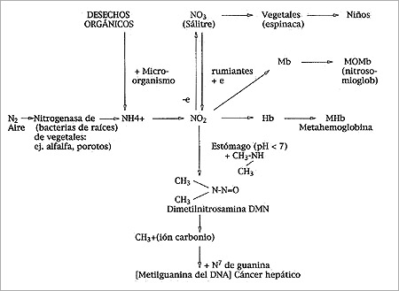 En el medio ambiente los nitritos , generados por compuestos a base de nitratos, pueden reaccionar, con aminas alifáticas y formar nitroso compuestos conocidos como nitrosaminas. De ellas la dimetilnitrosamina DMN y la dietilnitrosamina DEN son las más activas como alquilantes de macromoléculas, por ej. DNA. Esta acción alquilante les confiere a la DMN y a la DEN propiedades cancerígenas especialmente a nivel hepático y del esófago respectivamente(5,6).
