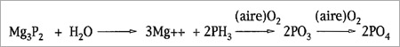 Por su parte la fosfina PH3 es rápidamente oxidada por el oxígeno del aire a hipofosfito y fosfato. O sea el P-3 activo ha sido detoxificado a P+5.
