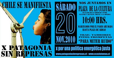 De esta forma el Movimiento Ciudadano Patagonia sin Represas está convocando para el sábado 20 de noviembre en Coyhaique a una marcha que se iniciará a las 14:30 horas en la Calle 1 (bifurcación de Bilbao a la altura de Comercial San Cristóbal) con Almirante Simpson, para descender al centro de la ciudad por esta avenida hasta Eusebio Lillo, y de ahí seguir por General Parra, Arturo Prat, paseo Horn y confluir en la plaza pentagonal.