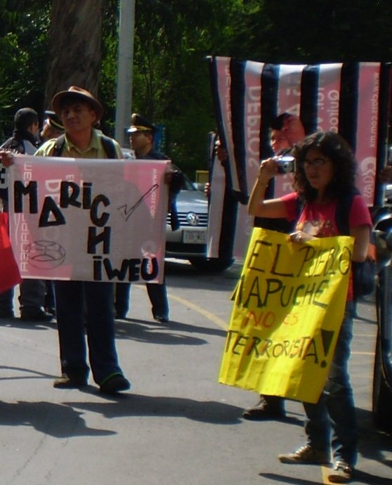 Con la bandera mapuche, sonidos de kultrún, pancartas y afafanes, chilenos residentes y mexicanos llegaron hasta la sede diplomática para hacer entrega al embajador Germán Guerrero una carta solicitando al gobierno chileno el fin de la aplicación de la ley antiterrorista a las causas mapuche, juicios justos para los comuneros, el término de los montajes judiciales en su contra y la desmilitarización de las comunidades mapuche.