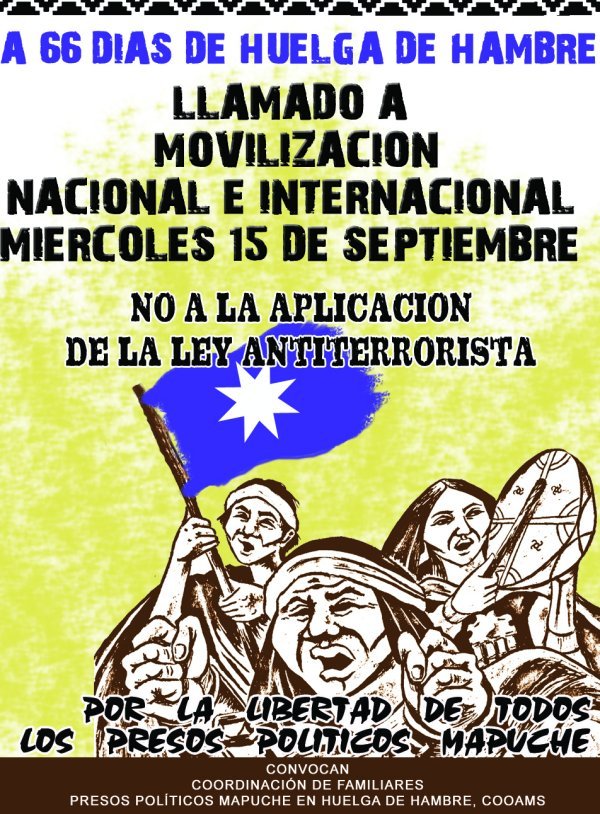 Con motivo de llevarse a cabo jornadas internacionales de solidaridad con los Presos Políticos Mapuche en huelga de hambre en las cárceles chilenas y cumpliéndose ya 65 días, convocamos para el día miércoles 15 de Septiembre a toda la comunidad en general; a las organizaciones y particularmente a todos los hermanos mapuche a participar de las distintas actividades que realizaremos en la localidad de El Bolsón.