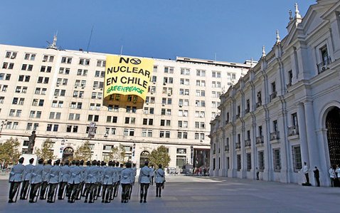 El lienzo con la frase "No Nuclear en Chile" fue desplegado desde la azotea de uno de los edificios de calle Teatinos mientras se efectuaba el tradicional cambio de la guardia en la sede del Ejecutivo.