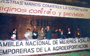 Con nuestras manos comienza la agroexportación ¡Queremos contrato y previsión! Con esta consigna la Asociación Nacional de Mujeres Rurales e Indígenas, ANAMURI (miembro de la Alianza por una Mejor Calidad de Vida) y la Confederación Nacional Campesina, NEHUEN, dieron marcha a una jornada emblemática que trató temas tan importantes como Previsión Social, Salud Laboral, Contratistas y Organización. Estos cuatro ejes se desarrollaron con meses de antelación en diversas visitas de terreno a las mujeres de temporada, donde se discutieron las problemáticas que las atañen en conjunto, además de aplicar instrumentos cualitativos que dieran las bases para la discusión de la Asamblea en un verdadero proceso democrático de reflexión, ya que 600 mujeres respondieron a este llamado.