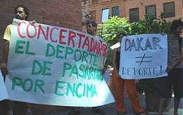 Con manifestación en las Puertas de Chile Deportes, organizaciones ambientalistas y sociales entregaron una carta en rechazo a la realización de la competencia automotriz denominado Rally Dakar, donde además, solicitan información a la brevedad “sobre todos los gastos de su Subsecretaría relacionados con el Rally”. Esto porque los manifestantes declararon que se están desviando fondos fiscales fundamentalmente para promoción, seguridad y urgencia en salud, fondos estatales que subsidian la carrera y que podrían destinarse a otras prioridades del deporte nacional.