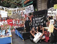 También se dio una vuelta por allí “la Parca”, encarnada por dos jóvenes actores de un grupo teatral de San Telmo. Ellos fueron los encargados de custodiar, según la receta del asambleísta porteño Rubén Saboulard, “el agua maloliente, con manchas de aceite y peces muertos”. Al lado, relucía su antítesis: una niña con la camiseta de la Selección Argentina (la 10 de Carlitos Tevez para más señas) y otra con casaca uruguaya jugaban con ranitas y peces de plástico en la pileta de lona. Alrededor, los asambleístas colocaron plantas frutales, tarros de miel, pan casero, naranjas y salames. “Todos productos que trajimos de Gualeguaychú”, comentó Saboulard, quien se encargó personalmente de hundir la bandera de Finlandia en el agua sucia.