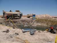 Informaron que a 200 metros del lugar encontraron camiones aljibe que extraían agua de un pozo de Corfo para las faenas de reparación de la carretera A-5 Norte, a cargo del Ministerio de Obras Públicas (MOP).