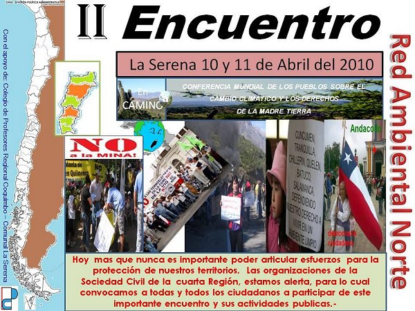 La Red Ambiental Norte, reunida en asamblea los días 10 y 11 del mes de abril 2010, quiere a través de este manifiesto denunciar y exigir solución a problemas vitales que se han hecho insostenibles en el tiempo y que pueden llevar a nuestras comunidades a una muerte inminente. Entendiendo que los gobiernos deben velar por el bien común y defender la vida de sus ciudadanas y ciudadanos, y de su pueblo es que expresamos: