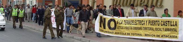 Los dirigentes Fabiola Flores representando a la Mesa Social Termoeléctrica Castilla Fuera, Región de Atacama, Alicia Monardes Presidenta de Junta de Vecinos de Totoral y Lucio Cuenca Director ejecutivo del Observatorio Latinoamericano de Conflictos Ambientales OLCA, encabezaron marcha desde plaza de armas de Copiapó hasta Corte de Apelaciones donde presentaron Recurso de Protección solicitando se anule la ilegal Resolución de Calificación Ambiental entregada el 1 de Marzo al proyecto Termoeléctrica Castilla del multimillonario brasileño Eike Batista.