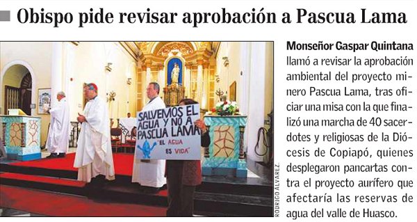 En cuanto al polémico proyecto de la empresa Barrica Gold, Pascua Lama, que se está instalando en el Valle del Huasco y que ha provocado el rechazo de la comunidad por amenazar el agua, el Obispo reiteró que la postura de la Iglesia siempre ha sido que todo proyecto peligroso para el hombre y la naturaleza debe ser rechazado hasta que no haya certeza de que no significará daño alguno.