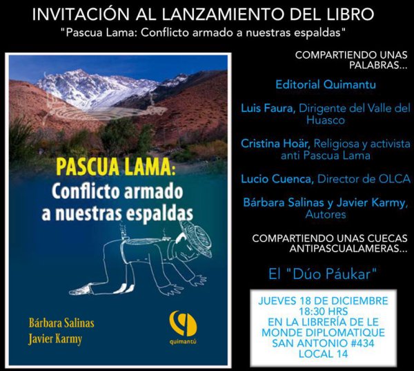 Invitamos al lanzamiento del libro "Pascua Lama: Conflicto Armado a Nuestras Espaldas" este jueves 18 en la librería del Le Monde Diplomatique (San Antonio 434, local 14) a las 18:30 hrs.