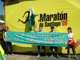 La consigna se remitía a un simple “corre por tu vida”, que resumía el sinsentido que implica destruir las reservas de agua a cambio de la extracción de oro, que dicho sea de paso, mayoritariamente se usa para alhajas y joyas. Además se refirieron al eslogan de esta Maratón 2009 que era “la ciudad es nuestra”, para dejarlo en “el agua es nuestra” sobretodo luego de ver que los corredores necesitaban hidratarse cada tantos metros avanzados.