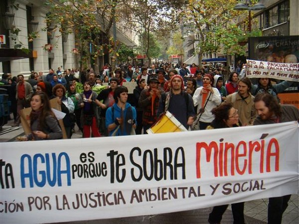 Más de cien personas caminaron por las calles peatonales de la capital santiaguina para llegar a las puertas del Ministerio de Minería y repudiar el anuncio que el Ministro Santiago González hizo la semana pasada -como si fuera vocero de la empresa- sobre el inicio del resistido proyecto binacional Pascua Lama de la cuestionada minera canadiense Barrick Gold.