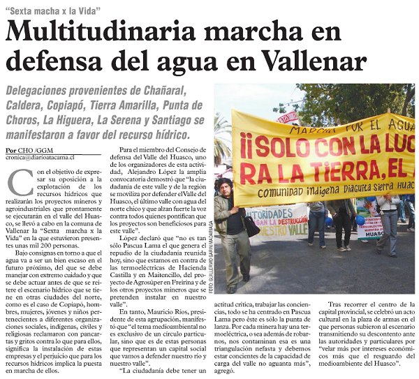 Una multitudinaria marcha recorrió las calles de Vallenar este mediodía, en lo que ha sido una fuerte y clara señal de que la comunidad del Valle del Huasco, directa afectada del proyecto minero Pascua Lama no ha bajado los brazos, sino que todo lo contrario, ha seguido en un trabajo sistemático de organización y generación de conciencia.