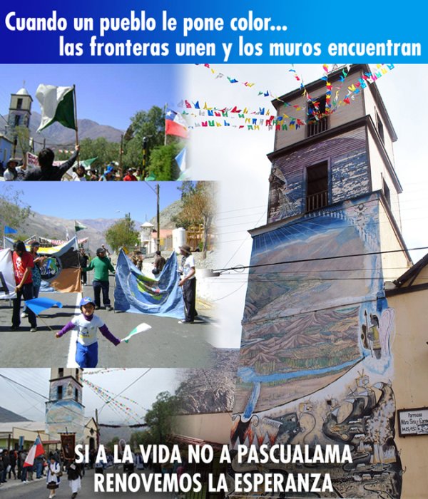 Uno de los íconos más significativos de la lucha contra Pascua Lama en el Valle del Huasco, es el mural de la parroquia de Alto del Carmen, mural que nació como una iniciativa comunitaria cuando el conflicto recién comenzaba, y que desde entonces atrae la mirada de todos quienes se suman a la causa: no es común ver una iglesia pintada desde el campanario hasta el suelo con una composición bella y directa sobre los impactos que la mega minería química causa en los valles agrícolas.