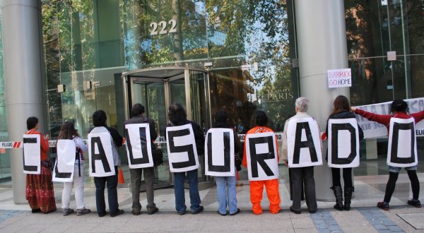 En la calle, unos cincuenta manifestantes se auto convocaron para hacer una performance artística que contaba con científicos con cianurómetros para medir la contaminación y detectar de dónde se originaba el peligro. Como era de esperar, la mayor concentración de contaminación provenía de las oficinas de Barrick Gold, tras lo cual se clausuró a la transnacional y se decretó el cierre de las faenas mineras.