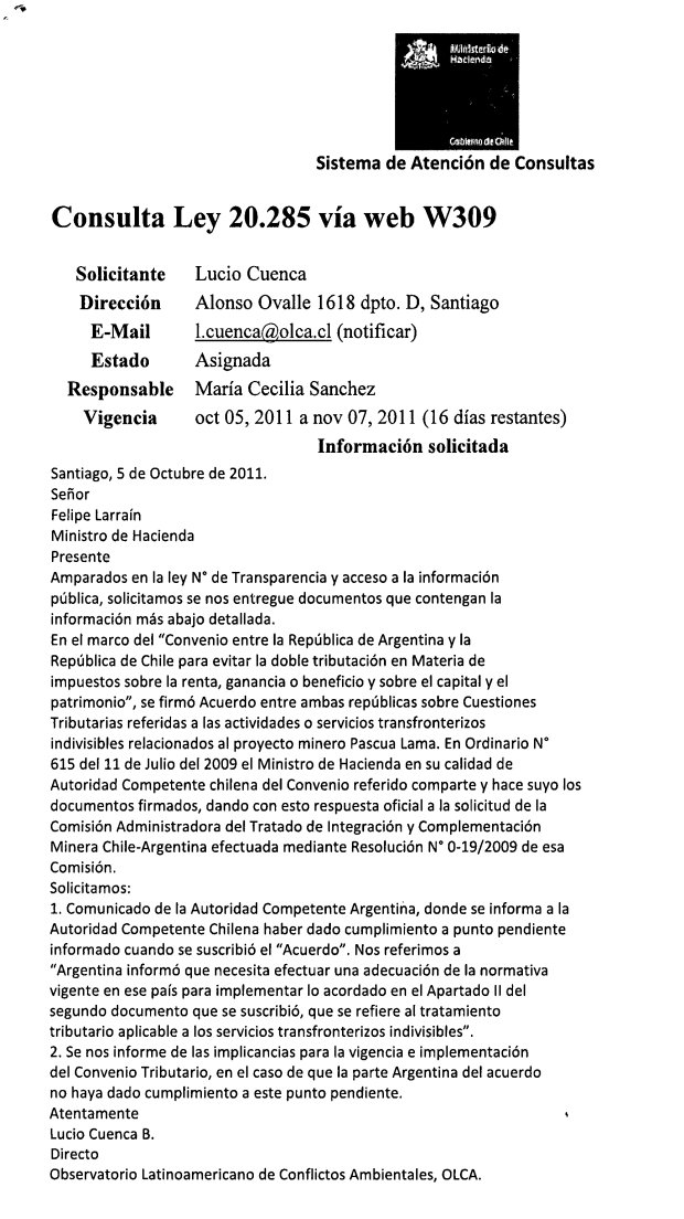 Estado de la solicitud de información efectuada por el Observatorio Latinoamericano de Conflictos Ambientales