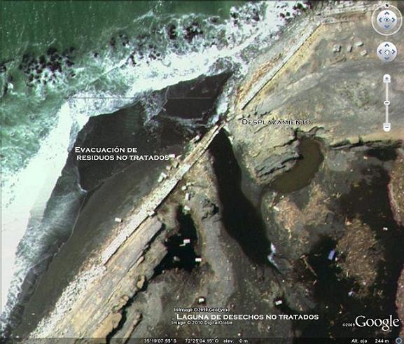 Hago envío de una serie de fotografías obtenidas desde GOogle Earth, que da cuenta de indicios sobre la fractura del ducto submarino de la planta de celulosa de Arauco en Constitución. Allí se ve claramente también que la laguna de emergencia, con desechos no tratados, fue desplazada por la fuerza del mar y los riles fueron vertidos directamente al mar, pudiendo representar riesgo para la salud de la población al verificarse además que la mancha de contaminación ha tendido a trasladarse hacia el río Maule.