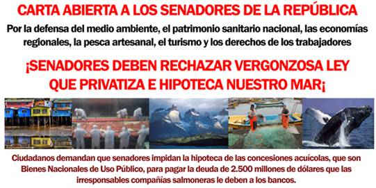 Llamamos a los senadores a rechazar esta verdadera “Ley de amarre” elaborada a la medida de los intereses de los bancos acreedores de una industria ambientalmente destructiva y socialmente irresponsable que intenta socializar esta billonaria deuda privada mediante la apropiación de bienes públicos, del dinero de los contribuyentes y la privatización de 1.700 km. de litoral de Chiloé, Aysén y Magallanes.