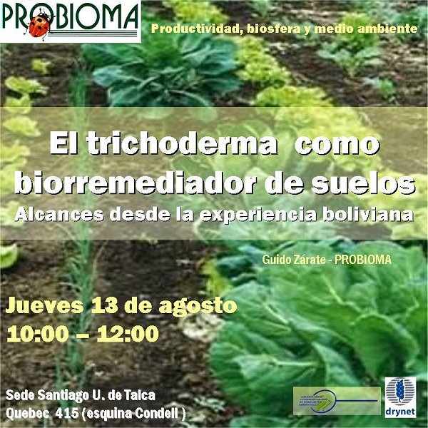 Cordialmente queremos invitarlos a participar de la charla titulada "El trichoderma como biorremediador de suelos. Alcances desde la experiencia boliviana", a cargo del ingeniero agrónomo Guido Zarate, quien expondrá sobre la experiencia de la organización boliviana PROBIOMA en biorremediacion de suelos contaminados y/o degradados.