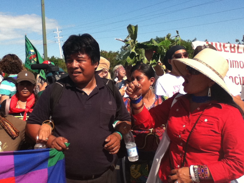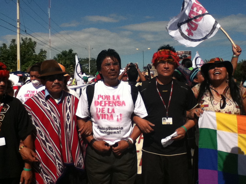 En Cancún – México. Mientras los representantes de estados de alto nivel a puertas cerradas siguen las negociaciones de la COP XVI de cambio climático, miles de manifestantes marchan en defensa de la Madre Tierra. El foro Internacional indígena sobre cambio climático partió a las 10 de la mañana desde Villa climática en una marcha pacífica que llevo tres horas. Mientras otro Grupo de indígenas se manifestaba dentro del espacio de negociación donde les fueron quitadas sus acreditaciones.