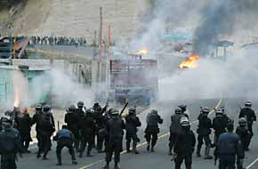La Policía lanzó bombas lacrimógenas en el kilómetro 140 de la ruta Interamericana para dispersar a la turba que se oponía al paso de un convoy que custodiaba un cilindro de la compañía Montana.