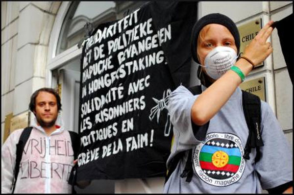 Un grupo de 40 activistas chilenos y belgas se tomaron la Embajada de Chile en Bélgica, en apoyo a los 32 mapuches presos que están en huelga de hambre en distintas cárceles en rechazo a la aplicación de la ley Antiterrorista.