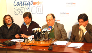 Santiago, septiembre 1º de 2008 (Ecoceanos, Olca, Conadecus) -Los dirigentes, Juan Carlos Cárdenas de Ecoceanos: Lucio Cuenca de Olca, Omar Pérez Santiago de la Liga Ciudadana de Consumidores y Hernán Calderón de Conadecus. Valoraron el espacio de diálogo abierto con la autoridad de salud, pero consideraron insuficiente la información que les fue entregada en la reunión, por insistieron en la medida precautoria de evitar el consumo de carne de cerdo y sus derivados.