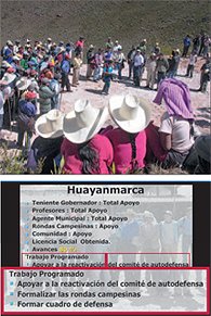 De las 21 diapositivas del PowerPoint llama la atención la referida al caserío Huayanmarca en la que el proyecto se plantea tres trabajos: "Apoyar la reactivación del Comité de Autodefensa", "Formalizar las rondas campesinas" y "Formar cuadros de defensa".