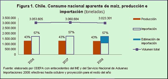 Hay que considerar además que Chile también produce maíz para el mercado interno, y hasta ahora, esa producción es convencional. En 2009, un 43% del maíz consumido en Chile provino de la producción nacional y el 57% fue importado (con Argentina, Estados Unidos y Brasil, como principales proveedores). Pero en 2010 bajó la importación de maíz lo que mejoró la situación de los productores nacionales. En esta temporada, entre abril y junio, se importaron en promedio 7.690 toneladas de maíz mensuales, cifra muy inferior al promedio de 24.647 toneladas importadas en el mismo período de la temporada anterior. El principal importador, Graneles de Chile, que durante el resto del año trae un promedio mensual de 70.708 toneladas de maíz, en el período de cosecha nacional de este año importó sólo 2.384 toneladas promedio por mes. En la temporada 2009/10, la superficie de cultivos de maíz abarca 122.547 hectáreas, con un rendimiento que alcanzó a 111 quintales por hectárea. (ODEPA 2)
